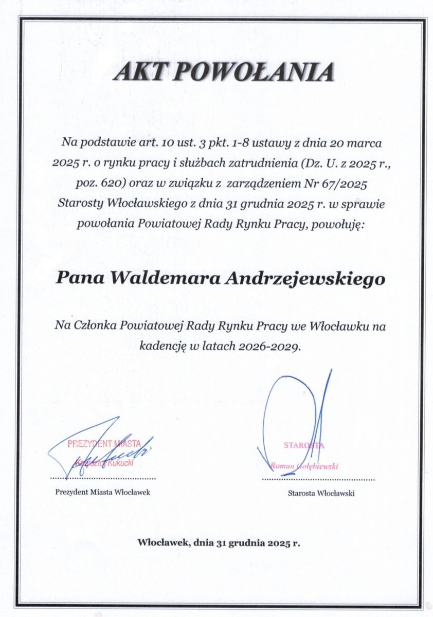 14.01.2026Z radością informujemy, że Waldemar Andrzejewski, reprezentujący Ośrodek Wsparcia Ekonomii Społecznej (OWES), został powołany do Powiatowej Rady Rynku Pracy we Włocławku.